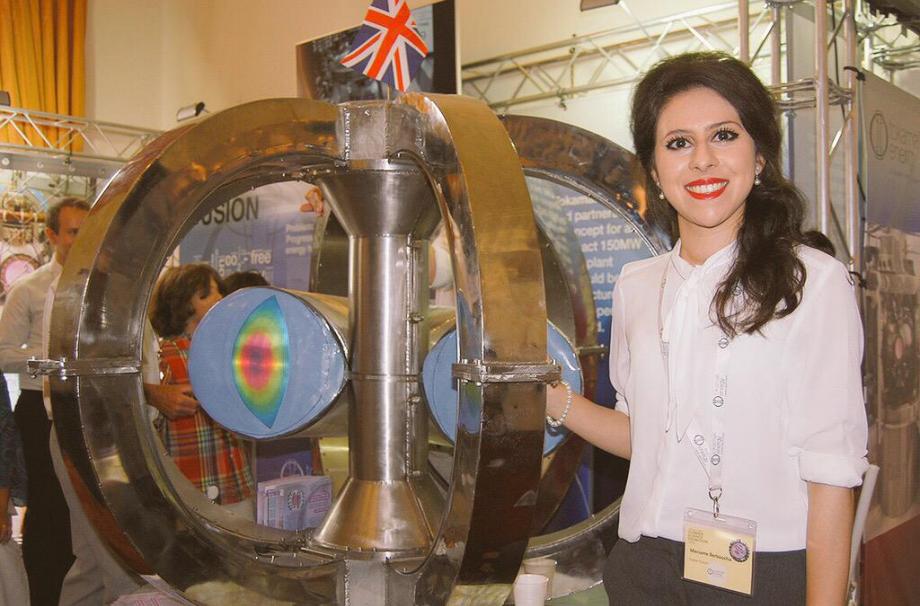 The picture in this post is Meriame standing next to a Tokamak. Meriame was asked by Twitter user @m_windridge to join @TokamakEnergy at the @royalsociety Summer Science Exhibition in June. This is a prestigious UK science event. Meriame says, "I spoke to the public about the work of Tokamak Energy which focuses on fusion."